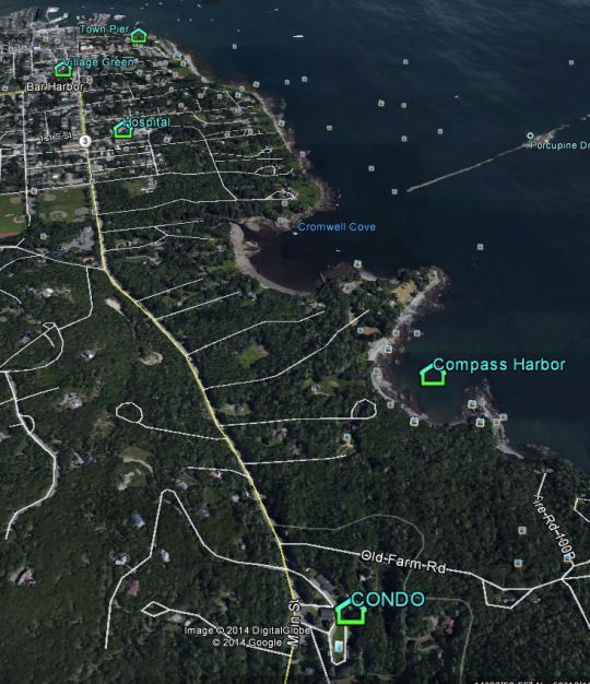 Picture labels from the top: Town Pier, Village Green, Hospital, Compass Harbor, Condo